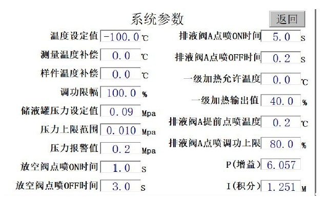 温度设定值:设置低温汽化器出口目标温度值;测量温度补偿:设置低温汽化器出口温度传感器校正值:样件温度补偿:设置样件温度传感器校正值;调功限幅:设置低温汽化器二级加热大输出功率;储液罐压力设定值:设置储液罐内目标压力值;压力上限范围值:设置储液罐内目标压力范围值:压力报警值:设置储液罐内目标压力上限报警值;放空阀点喷